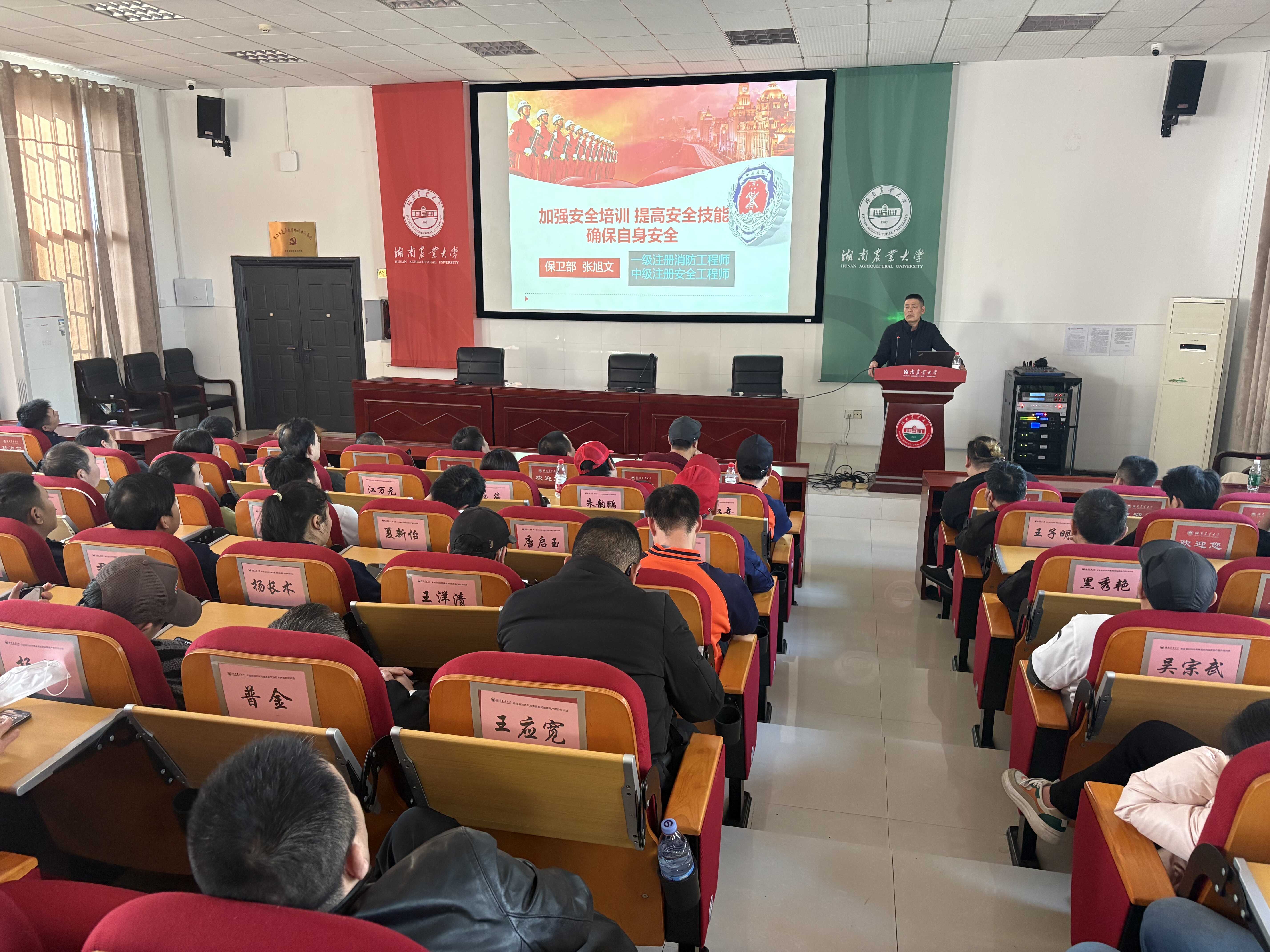本次培训特邀湖南农大保卫处张旭文科长、长沙市新奥燃气安全宣讲员刘欢授课。张旭文科长重点讲解了食堂火灾诱因及应急处置流程,刘欢详细讲解了燃气特性、设施巡检、隐患识别及泄漏应急处置要点。此外,参训人员还观看了安全警示教育片。